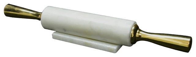 Banswara Rolling Pin With Gold Metal Handle. Its matching stand makes it easy to put this beautiful piece on display. Made of marble and metal . Measures 17″x2″x2.5″
