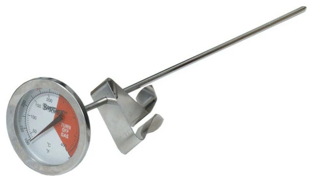 Check the temperature of your oil in your turkey fryer with our stainless steel turkey fryer thermometer. If you are looking for a replacement thermometer for your turkey fryer, you have come to the right place. We get thousands of phone calls every year from people who have lost their turkey fryer thermometer or someone’s walked off with it. Is this you? The Bayou Classic turkey fryer thermometer is stainless steel and dishwasher safe. This turkey fryer thermometer reads the temperature from 100 degrees to 750 degrees. There is a red fire hazard zone starting at the 450 degree point. The stem of the thermometer measures 12″ long.