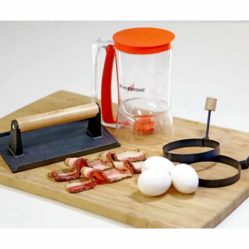 Blackstone Breakfast Kit is the most convenient way to do breakfast on the griddle. This kit saves time, dishes and clean up and helps makes you look like a pro at making breakfast! The Blackstone batter dispenser holds up to 4 cups (32 ounces) of batter and is easy to use for perfect pancakes every time. Can be used for making pancakes, cupcakes, muffins, etc. The Blackstone bacon press is made of pre-seasoned cast iron which provides even heating as well as retention, eliminating hot spots. Excellent for making grilled sandwiches on the griddle as well.The Egg Rings are 4″ diameter, steel with non-stick properties, have a wood handle, great for making eggs as well as small pancakes. These have a wooden knob handle that fold for easy pick up and storage.