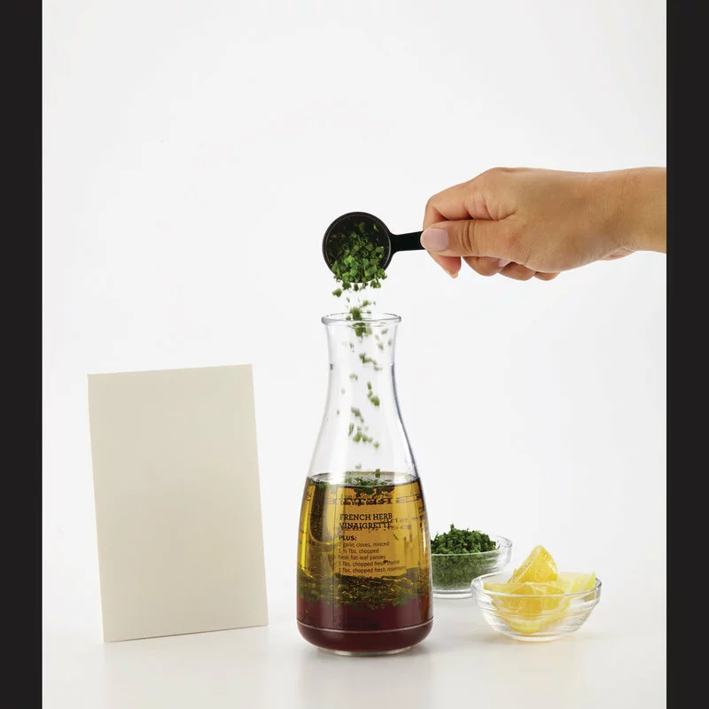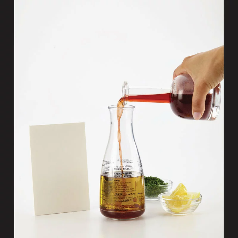 Durable plastic carafe imprinted with four dressing recipes and easy-to-use measurement lines; rubberized base ring helps keep the carafe from slipping.