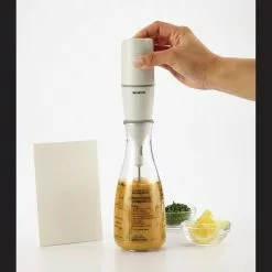 - Includes a hand-held automatic mixing unit with detachable blade and soft-touch button.