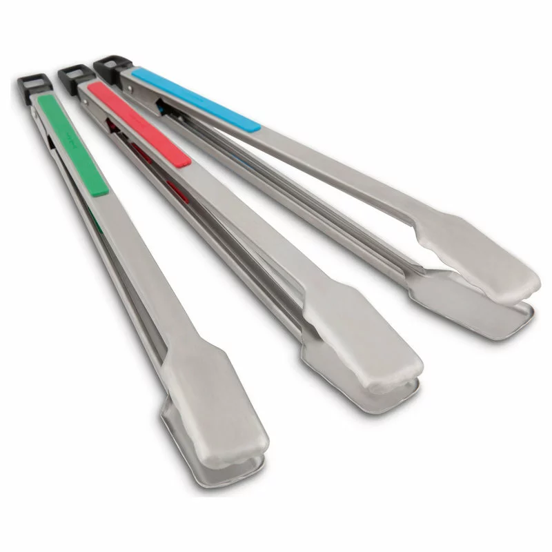 The Grill Tongs, 3-Pack offers a premium accessory set for use with your grill. The Broil King Imperial professional stainless steel locking tong is designed to combine the lifting function of a grill turner with the gripping power of grilling tongs. The locking mechanism also doubles as the hanging hook. The grill tong features high density resin handles inset with the stainless steel Broil King logo. This set features three sets of tongs with color-coded handles to help manage allergies, dislikes, or cross-contamination.