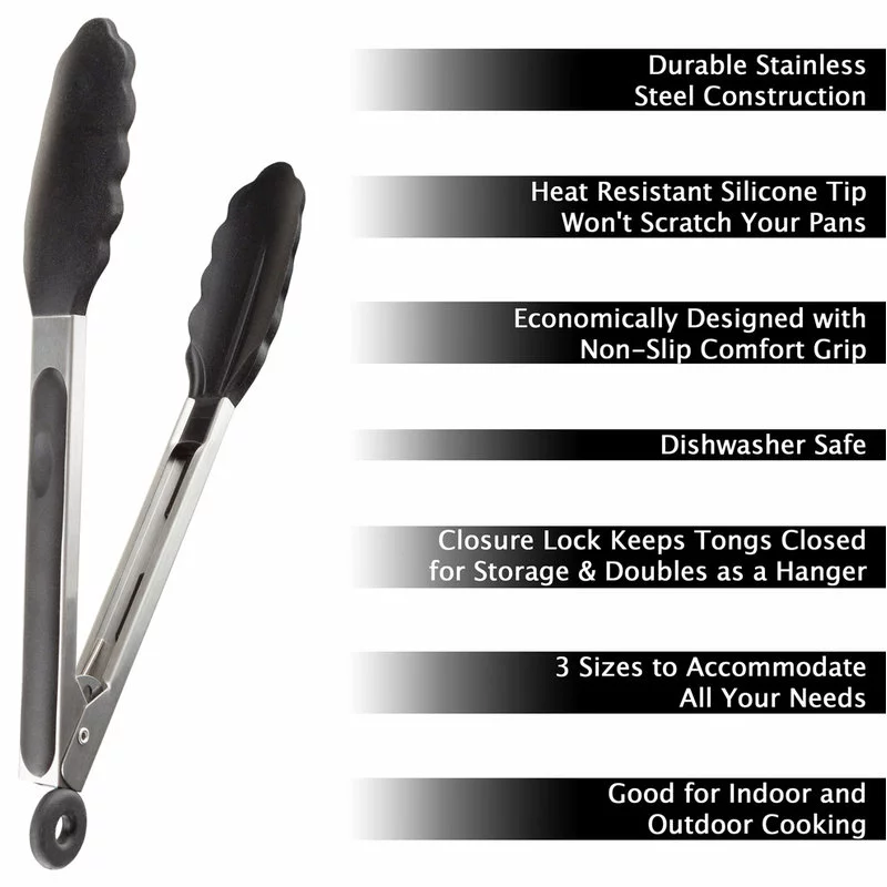 PRODUCT DETAILS- 3 sizes of kitchen tongs with dimensions from tip to end: 13, 10.75, 9. This set is made of durable stainless steel with heat-resistant black silicone tips. For easy cleaning, these tongs are also top rack dishwasher safe.