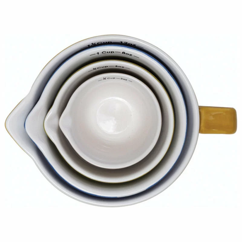 These charming measuring cups are inspired by vintage batter bowls. Perfect for your cooking needs, the inside of each of these measuring cups is marked in both ounces and cups. One side of each is designed with a V-shaped spout for easy pouring. They stack inside each other for easy storing and are dishwasher safe.