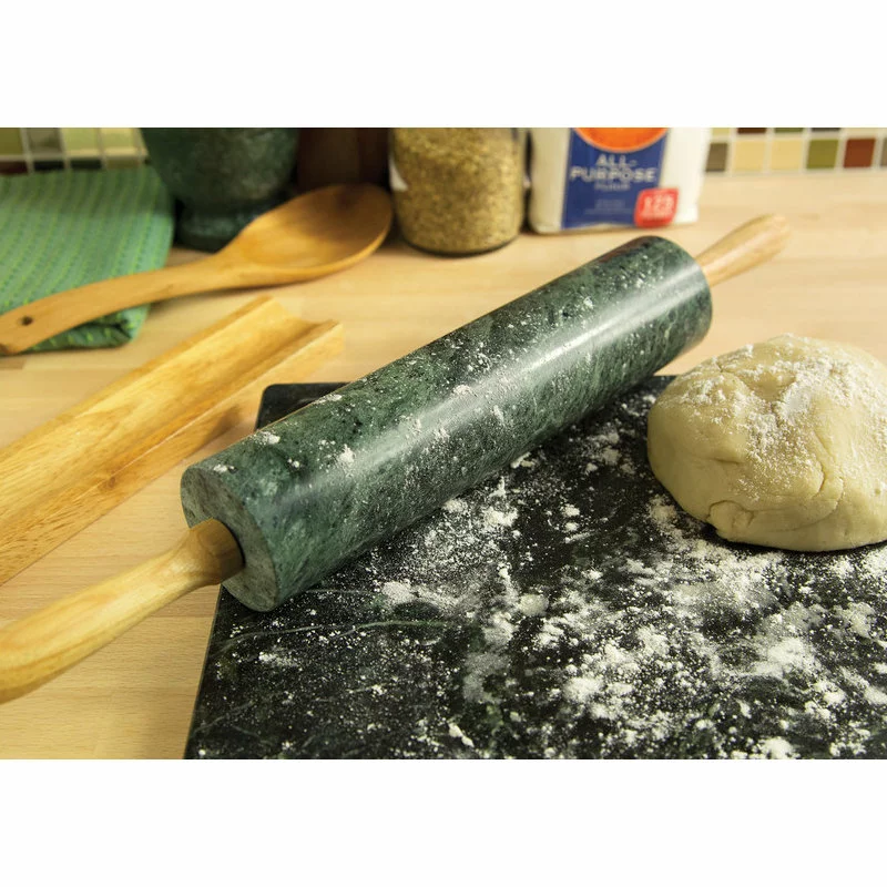 Enjoy baking cookies or rolling out your own pizza dough with the family? Then bring some ease to your baking with this Green Marble Rolling Pin! The rolling pin is 10″ long, has nylon ball bearings for a smooth rolling, wooden handles for easy grip, and a wooden base for rest. The marble helps keep the dough cool while rolling, and its natural non-stick properties keep dough from clinging. Even the toughest doughs are flattened easily and effortlessly. Let the smoothness and heft of this rolling pin do the hard work for you!