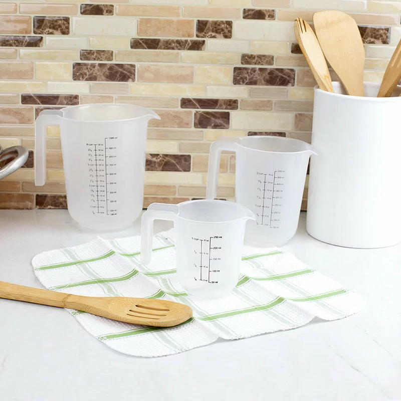 Confidently measure all your ingredients precisely with this set of stackable plastic measuring cups. Equipped with shorter handles it provides better balance than longer and slimmer gripped versions. The durable plastic construction ensures you can use it to scoop a large amount of flour or sugar without fear of it bending or breaking in the process. Each of the cups offer a wide-mouth making it easy to use pour items such as oats and beans directly into them without spilling. The fade-resistant measurement markings are both labeled in millimeters on one side with cups and ounces on the other for even more convenience, while baking and cooking.COMPLETE 3 PIECE SET FOR ANY SIZE MEASURING TASK: The set comes in three convenient sizes, with the largest of the two being incredibly useful for measuring out thick batters. 1 cup, 2 cup, 4 cup included.DRIP-FREE POUR: Unlike narrower versions of the kitchen measuring cup sets, these plastic measuring cups offer a wider mouth to easily pour items such as huge bag of oats and lentils without spilling.SHORT AND STURDY, EASY GRIP HANDLES: The handles are thick and smooth-to-the-touch, offering strength and comfort while in use. The shorter handles also provide better balance when nest within each other in the cupboard or fully empty when standing up.DESIGNED TO LOVE AND LAST: Made of durable, break-resistant plastic, this set of measuring cups are designed to meet all your measuring tasks for years to come. These measuring cups are lightweight for easy lifting with durable and smooth handles for comfortable pouring. With 3 sizes and a precise measuring guide you can portion out the amount for all your baking, cooking, and grilling needs.STANDARD AND METRIC MEASUREMENT MARKINGS: Measurements are displayed in both standard and metric for convenience. The lettering is very clearly defined and in a color that holds a good contrast against dark liquids.