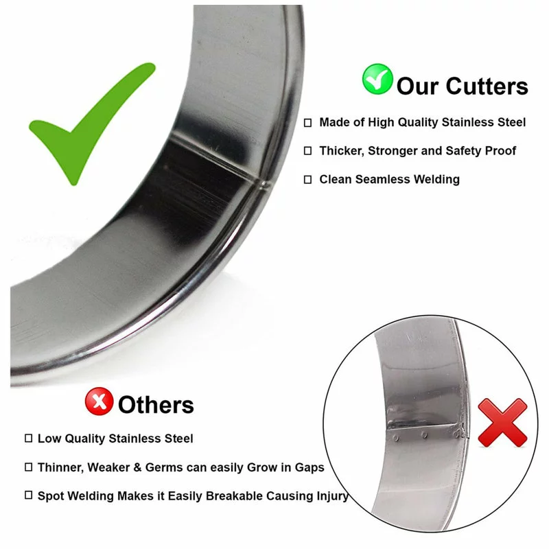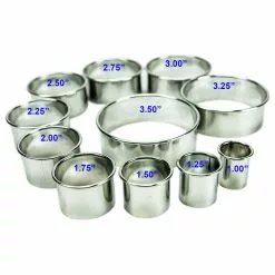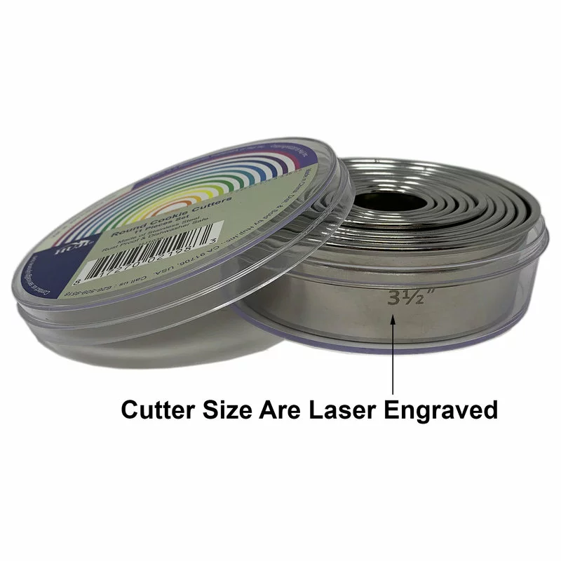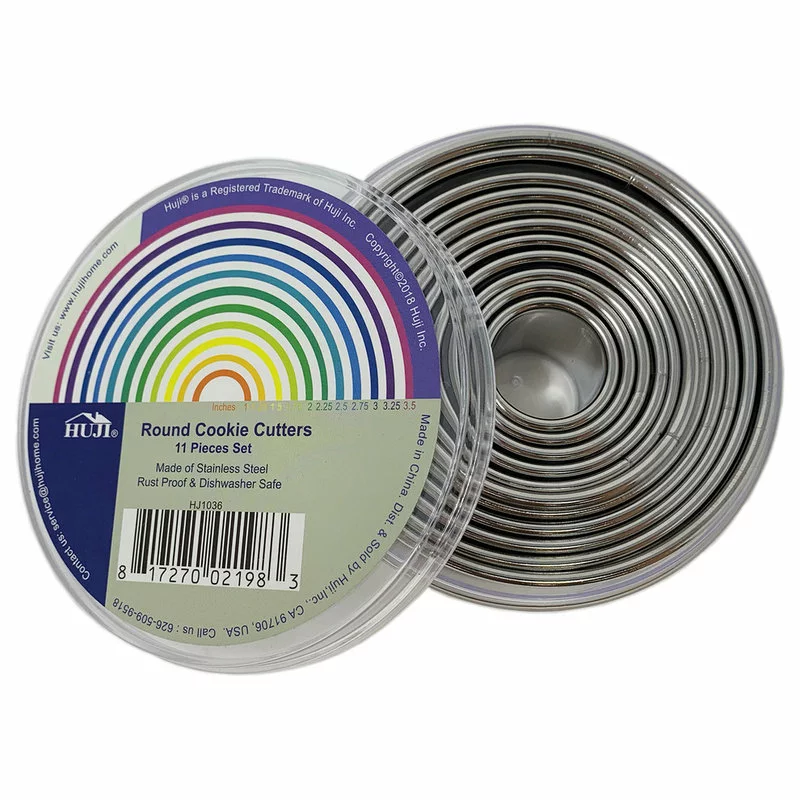 Set includes 11 round cutters with solid, plain edges. Cutters are made of high-quality stainless steel and range in size from 3/4″ to 3 5/8″ rounds. Perfect for cutting pastry dough, cookies and any other dough such as pizza dough. The set comes in a nicely designed case for easy storage. This set also makes a great gift for baking enthusiasts. Easy to clean, dishwasher safe.