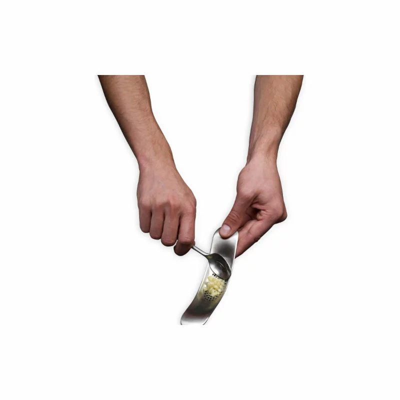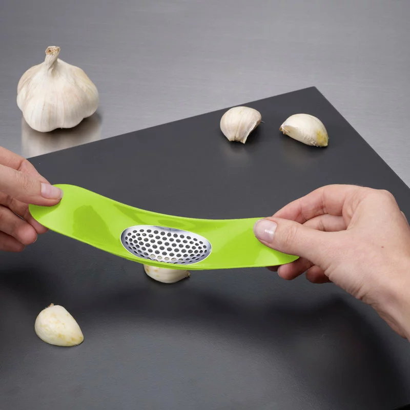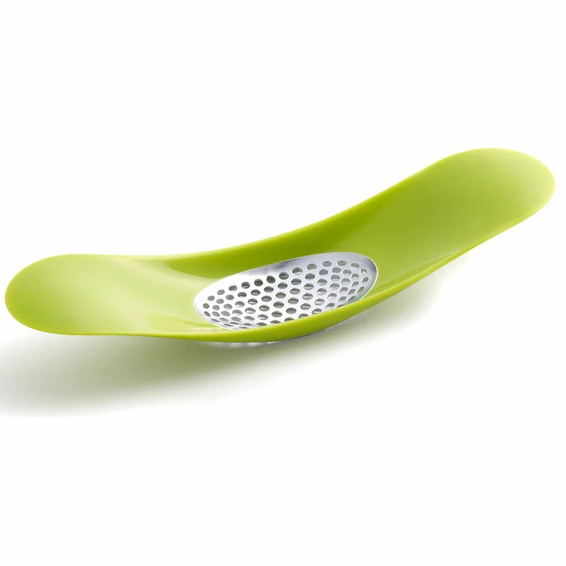 Easily crush garlic using minimal effort with this Joseph Joseph garlic rocker. It features a stainless steel grate/blade and a green plastic handle that is ergonomically deigned to fit comfortably in your hands. This innovative rocker allows the user to roll over a piece of peeled garlic, crushing it and forcing the piece up through the grate. The curved design allows you to easily scoop crushed garlic and conveniently place it in a pan for cooking. It is also dishwasher safe, making clean up a breeze. This Joesph Joseph Rocker garlic crusher is the perfect addition to any kitchen.