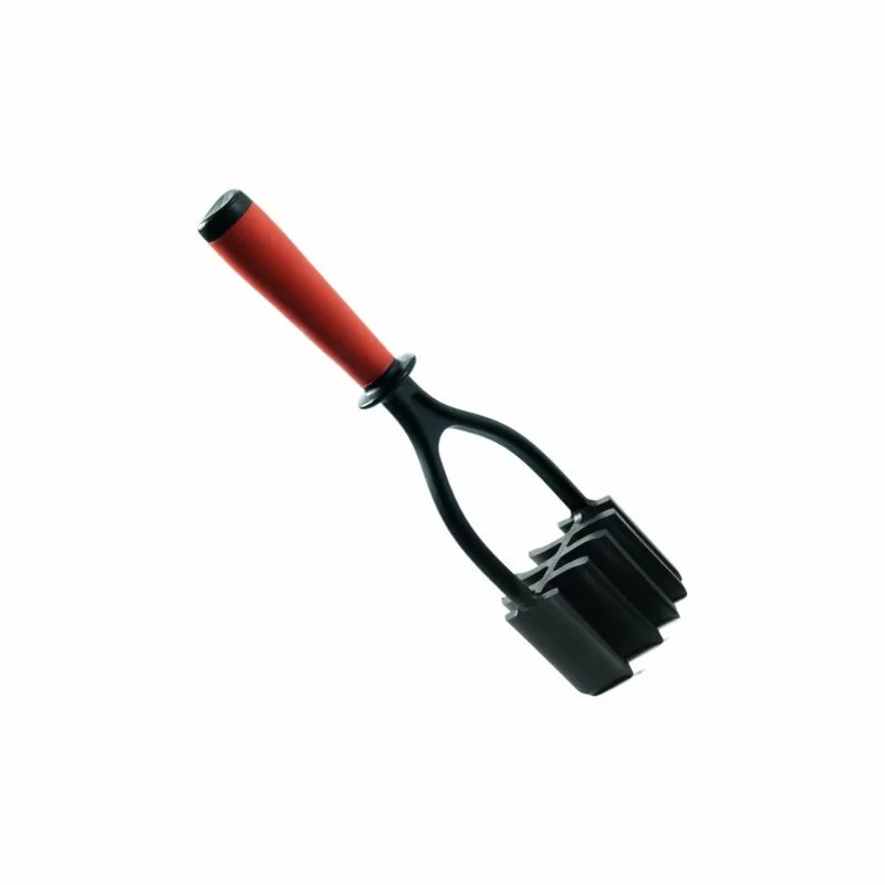 Prepare ground beef, whole tomatoes for sauces, or avocado for guacamole quickly using the Norpro Grip-EZ Chop/Stir/Mash kitchen tool. In a black color with a red handle, it features a beveled wavy shape to break down foods. It can also be used to mash sausage, scrambled eggs, or mash potatoes. Safe to use on nonstick cookware, the Chop/Stir/Mash is heat resistant to 450 degrees Fahrenheit, so you can prep food directly in the cooking pan.