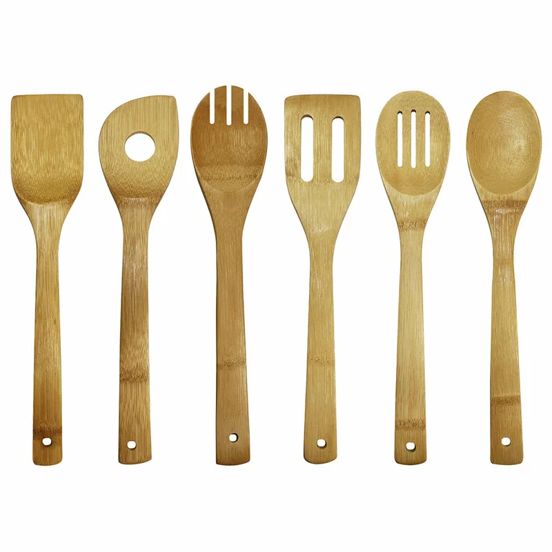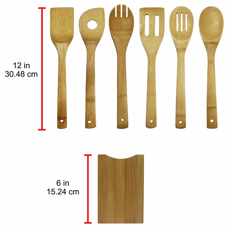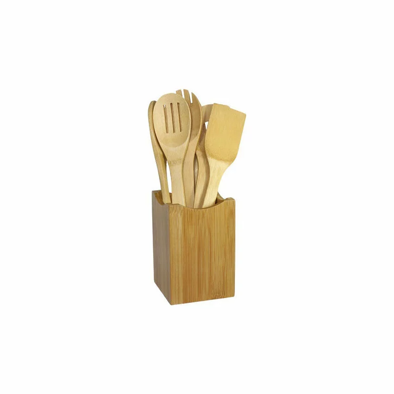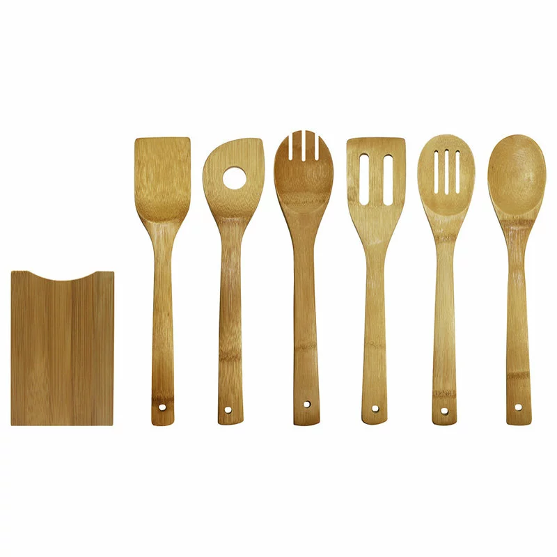 - 7 Piece Bamboo Cooking Utensil Set (a Turner Spatula, a Rounded Fork, a Single Hole Mixing Spoon, a Slotted Spatula, a Slotted Spoon, a Bamboo Spoon and a Bamboo Holder)