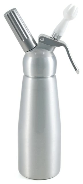 Prepare innovative dishes in the kitchen with the Orka brushed aluminum .5 liter gourmet cream whipper. This whipper is designed to be used with hot or cold preparations such as vegetable foams, sauces, creams, and whipped cream. Each whipper comes with a leaflet with recipes, a charger, a cleaning brush, and two different decorating tips. Capable of being used as a soda siphon as well, simply insert a CO2 cartridge instead of N2O. This whipper is perfect for serving four to six people and it comes backed with a two year manufacturer guarantee.