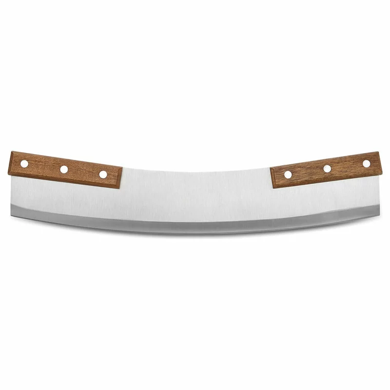 Beautiful acacia wood handled pizza rocker with rivets, made in the artisan craftsmen style of knife makers of years ago, bonus clear polycarbonate edge protector included. The extra-sharp hand-edged blade is 13″ long (made of high carbon stainless steel) and 0.65″ thick, so it makes quick work of slicing a pizza pie.