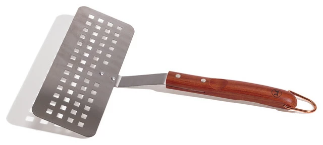 The accustomed griller will be primed to barbecue with this practical and dependable fish spatula. The slotted extra wide face works gracefully flipping fish and longer cuts of meat by supporting the whole piece. Apart of an extended family of tools, this beneficial tool is down to earth and projects attractive aesthetic features. The ergonomic rosewood handle provides optimal comfort and control while the stainless-steel construction harnesses impeccable durability.
