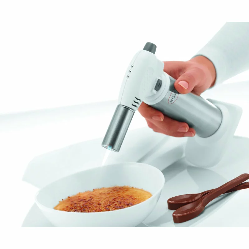 Kitchen TorchIdeal for desserts such as Cr me Br l e, as well as for vegetables or meat. Adjustable dial for flame regulation (up to 1300degreeC/2.372degreeF). Topple free base and practical setting for continuous operation (up to 60minutes). Refillable with commonly available lighter gas. GS and T V approved. With child proof safety switch.