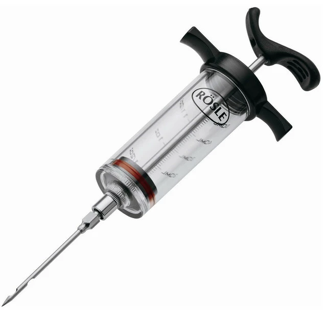 Enjoy perfectly marinated meats in no time time with this Rosle marinade injector. Featuring a stainless steel frame with a clear plastic chamber and sturdy black plastic handle, this marinade injector is the perfect grilling companion. Simply inject the marinade directly into the meat using the large needle, and your meat will be infused with flavor, eliminating long marination times. The detachable needle also features a quick lock mechanism. The injector can hold up to two ounces, and the measurement indicator on the barrel has both fluid ounce and milliliter markings. Backed by a manufacturer’s lifetime warranty, this marinade injector is easy to disassemble and some parts are dishwasher safe.