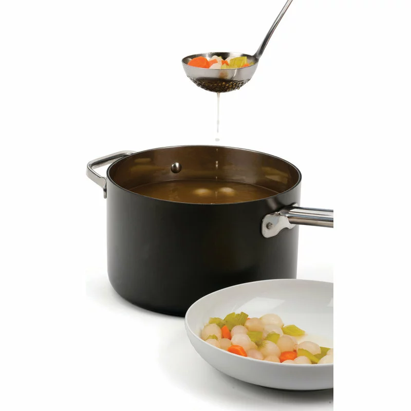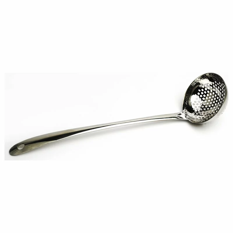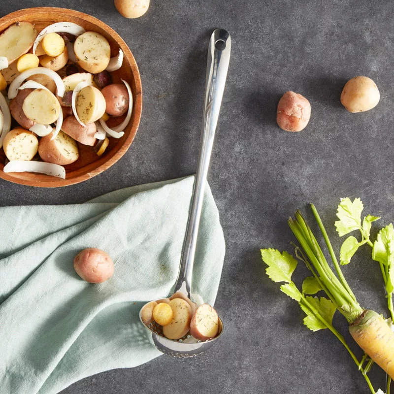 Easily serve chicken and dumplings with this RSVP Endurance straining ladle. Made from precision pierced 18/8 stainless steel, it is designed for durable and long lasting use. Perfect for serving, use this perforated ladle to separate foods from liquids. With a hanging hole for convenient storage, it is also dishwasher safe for easy clean up.