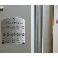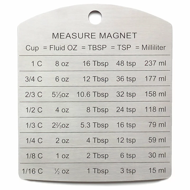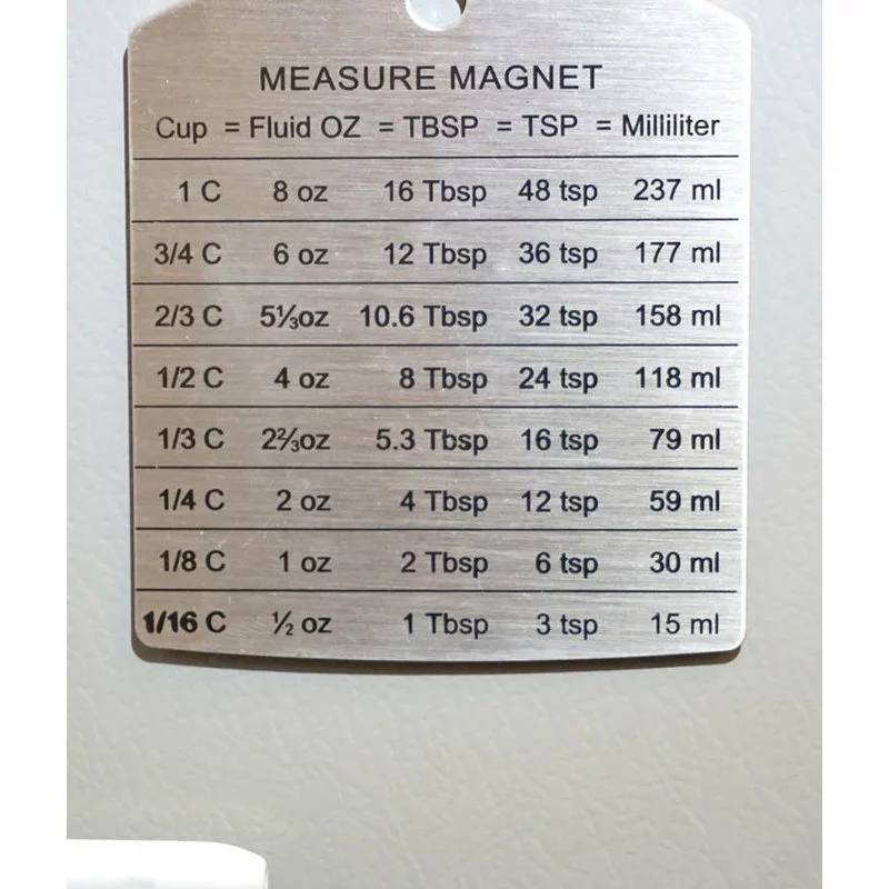 Easily figure out metric conversions using this RSVP Endurance measure conversion magnet. Made from stainless steel, it features a brushed exterior. It displays conversions for cups, fluid ounces, tablespoons, teaspoons, and milliliters. Use the strong magnetic backing to attach it to the refrigerator.