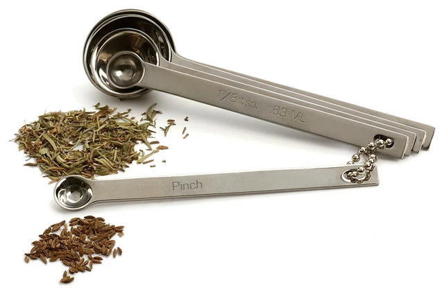 Measure even the oddest sizes with this set of five measuring spoons from the RSVP Endurance line. Constructed form stainless steel, these spoons are durable and reliable. With their classic rounded bottom design, easily scoop up ingredients. Designed specifically for those odd measurements, this set includes a two teaspoon, one and a half teaspoon, 2/3 teaspoon, 1/8 teaspoon and a pinch, or 1/16 teaspoon, measurements. Ideal for bakers, this set of measuring spoons is dishwasher safe, making clean up a breeze.